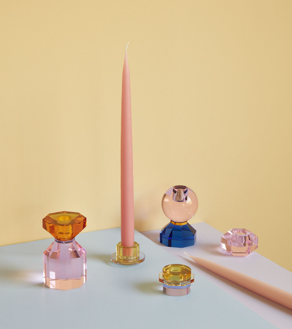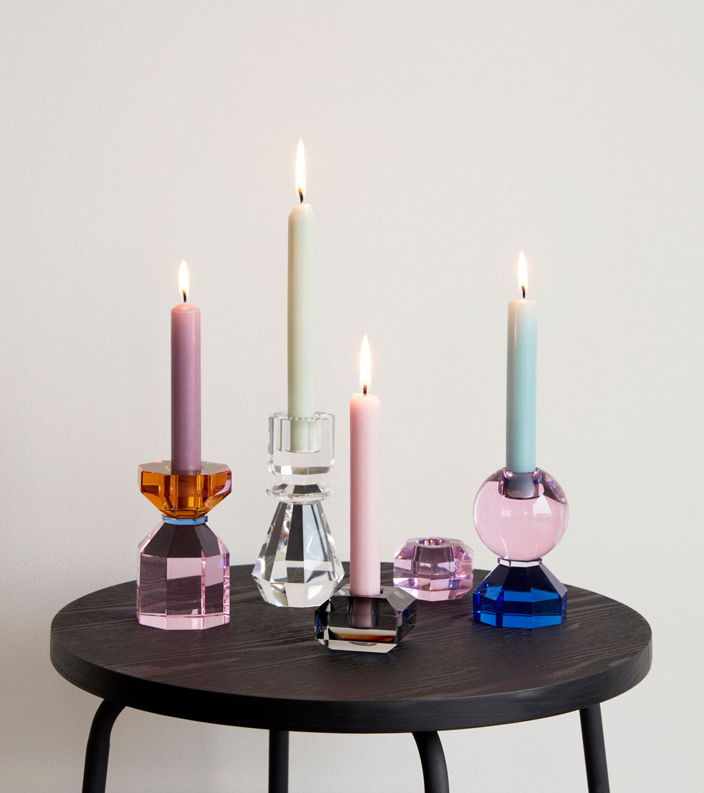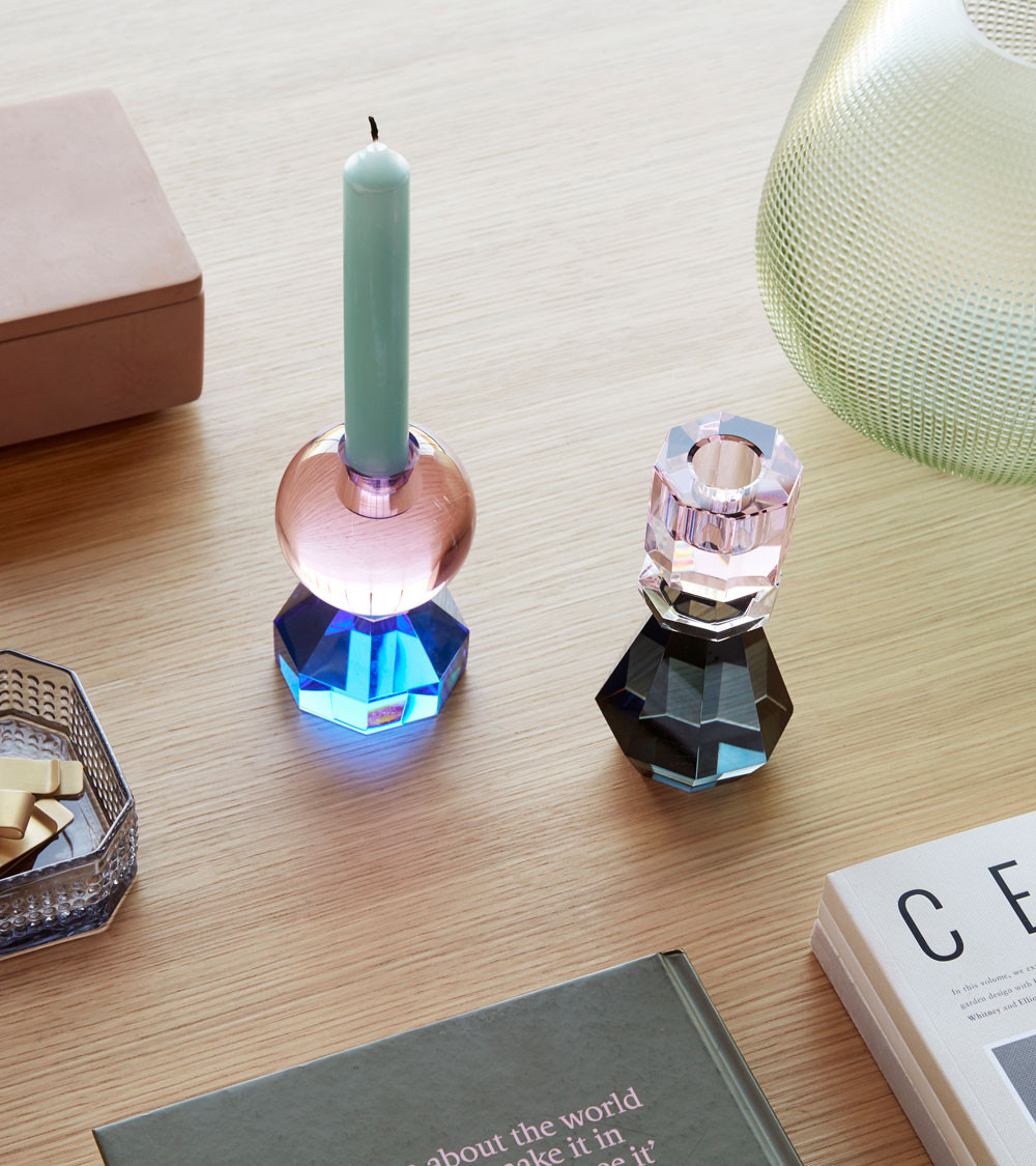 Le bougeoir est en cristal et en verre. Sa forme spéciale ainsi que la combinaison du bleu et du rose lui confèrent un look élégant et moderne. Ce produit est fait à la main et peut donc varier