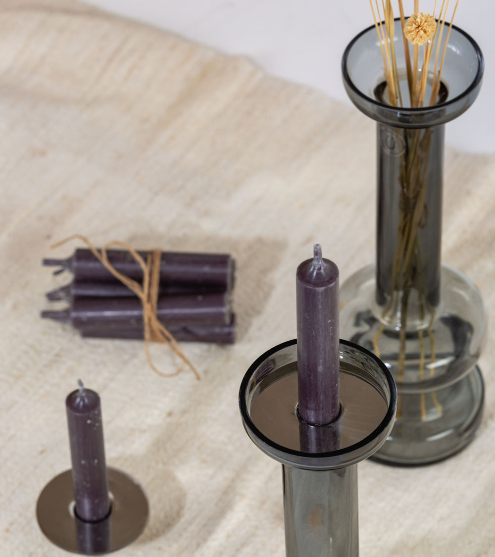 Chaque vase-bougeoir est fabriqué à la main, un processus qui garantit des finitions uniques. Le verre soufflé à la bouche est travaillé avec expertise pour obtenir une transparence parfaite et une teinte fumée, symbole de simplicité et de raffinement. Sa double fonctionnalité en fait un objet décoratif essentiel, qui allie esthétisme et praticité.
