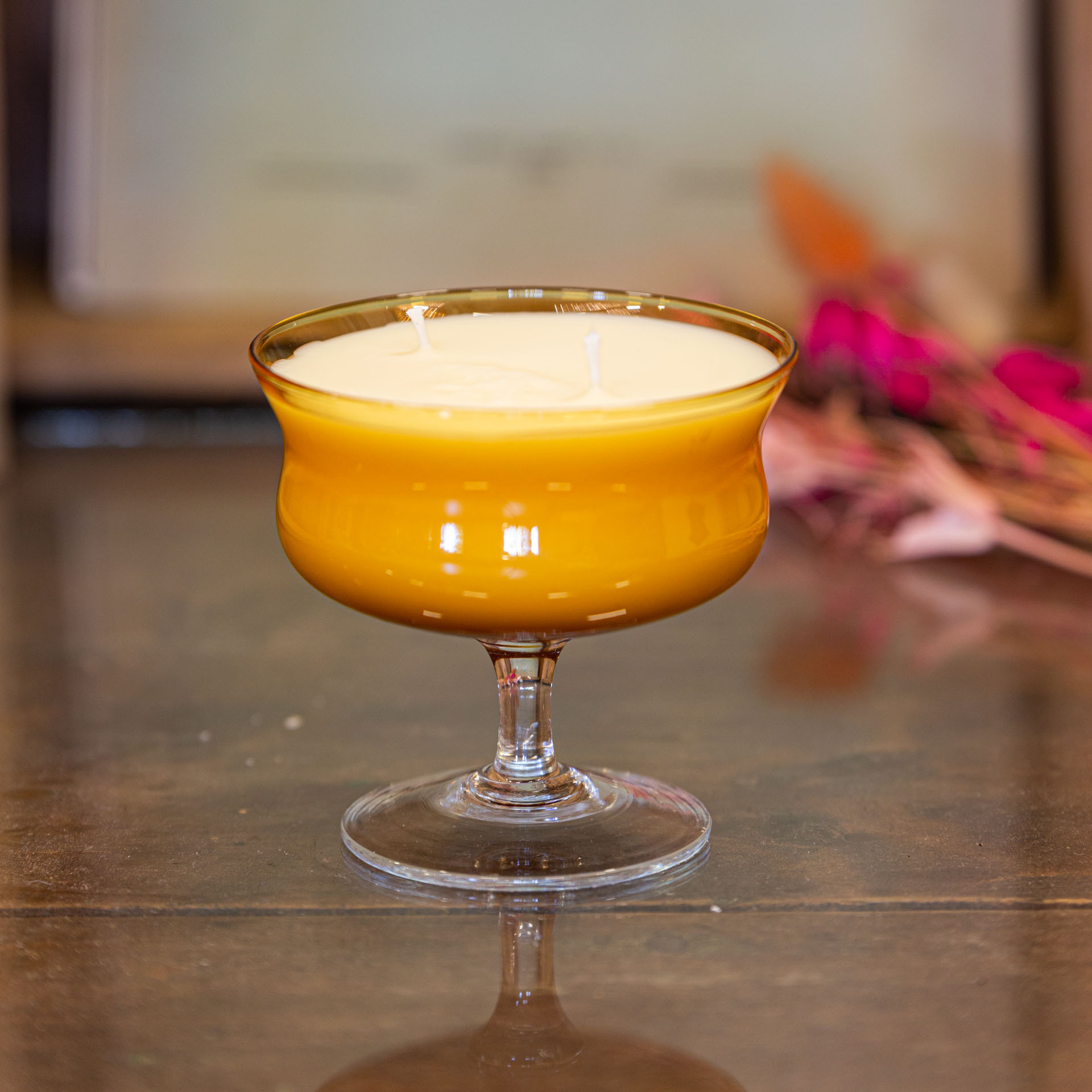 Chaque exemplaire d’Elba est coulé dans une coupe à dessert vintage soigneusement chinée, ici dans une teinte jaune lumineuse qui rappelle le soleil méditerranéen. Ce choix de contenant illustre parfaitement la philosophie de l’upcycling, qui valorise les objets existants en leur offrant une seconde vie. Une fois la cire consumée, la coupe peut être réutilisée comme verrine, pot ou élément décoratif, renforçant ainsi sa dimension durable et pratique.