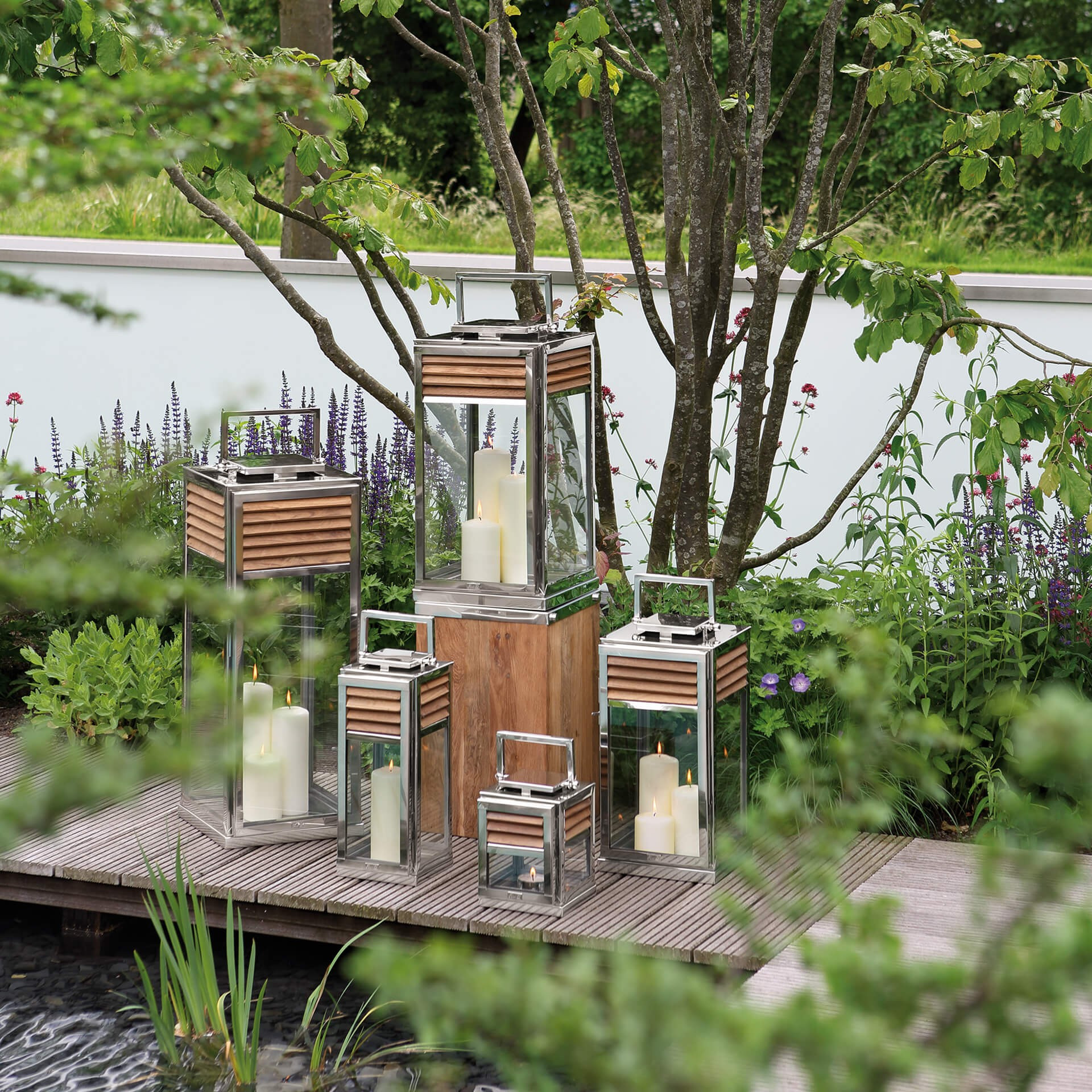 Les lanternes GENUA allient élégance et matériaux haut de gamme : teck naturel et acier inoxydable brillant.